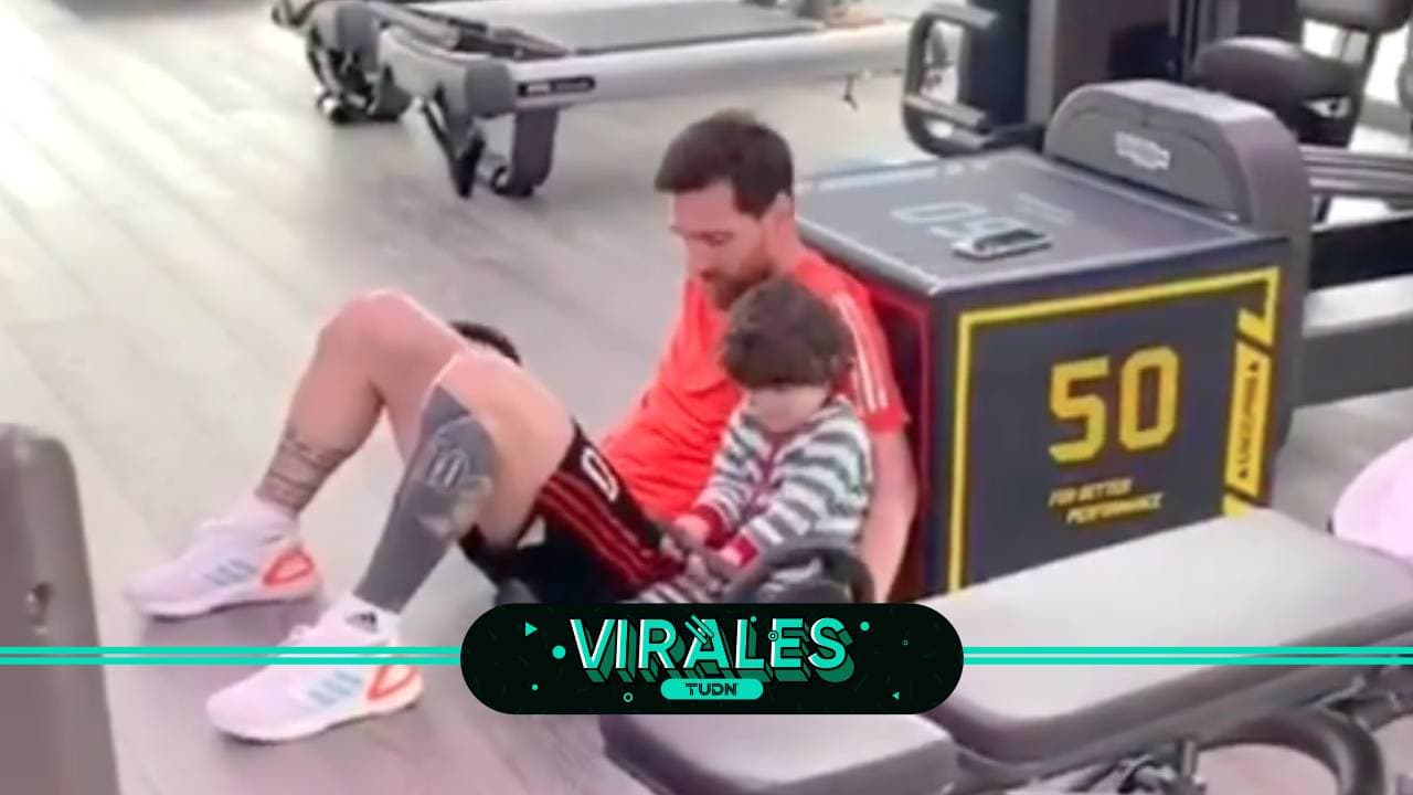 El astro del FC Barcelona presume trabajo de gimnasio en casa acompañado de uno de sus hijos.