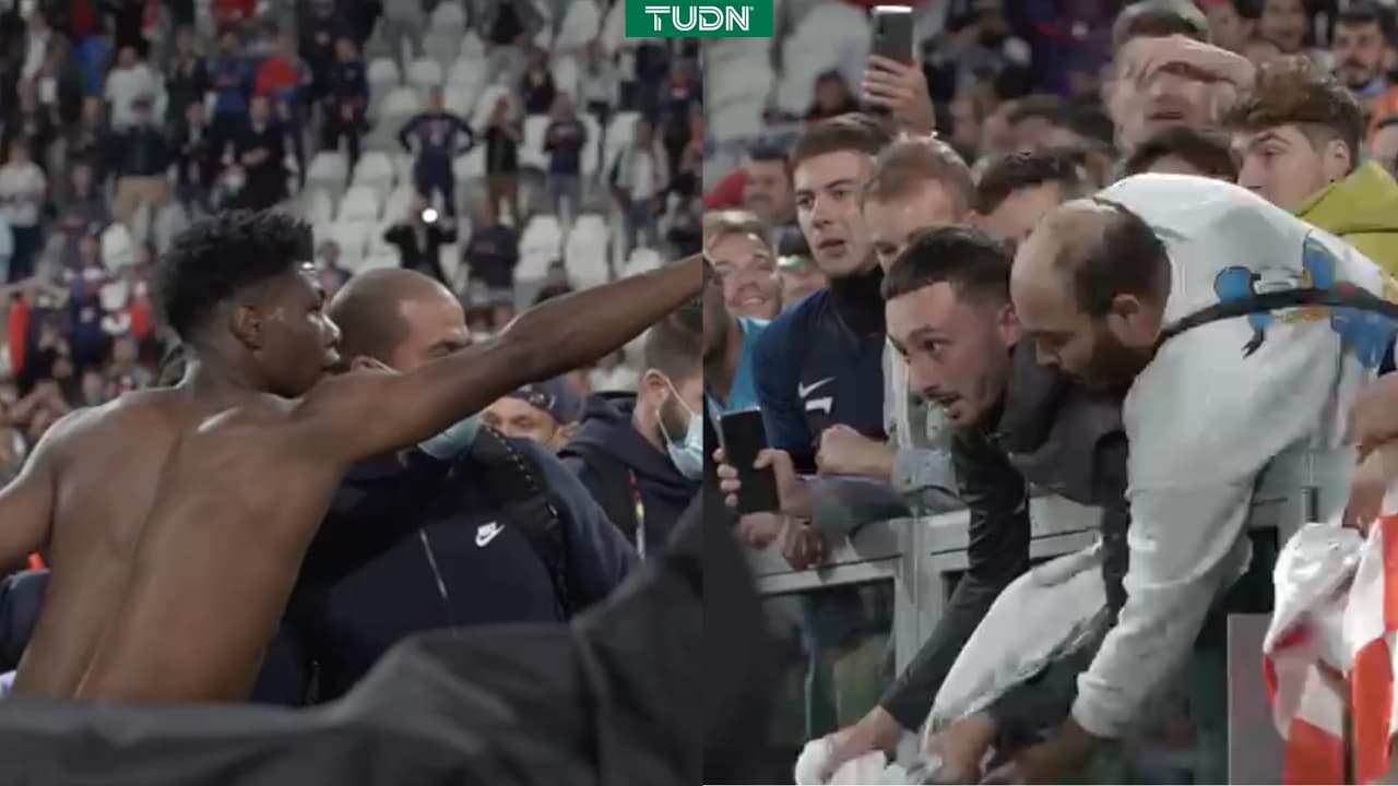 El jugador del Atlético de Madrid le entregó su camiseta a un fan y desató empujones y jaloneos en la tribuna del estadio en Italia.