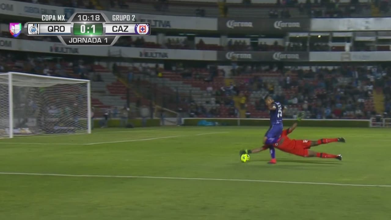 El arquero de Cruz Azul tuvo una mala salida en su intento de cortar el balón y le dejó la portería sola al delantero de Gallos para el 1-1.