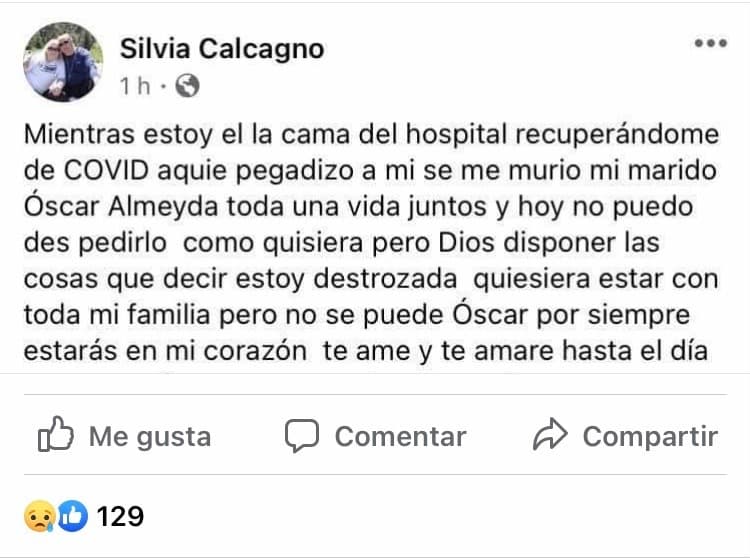 “Mientras estoy en la cama del hospital recuperándome de COVID aquí pegado a mí se me murio mi marido Óscar Almeyda; toda una vida juntos y hoy no puedo despedirlo como quisiera pero Dios dispone las cosas. Qué decir, estoy destrozada. Quisiera estar con toda mi familia, pero no se puede, Óscar por siempre estarás en mi corazón te amé y te amaré hasta el día que nos volvamos a encontrar amor de mi vida”, escribió.