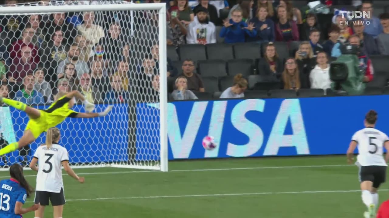Las alemanas fueron las primeras en lanzar avisos sobre la portería de Peyraud-Magnin, pero la portera francesa reaccionó muy bien en los dos disparos y bajó la cortina de su cabaña hasta que llegó el tanto que abrió el marcador.