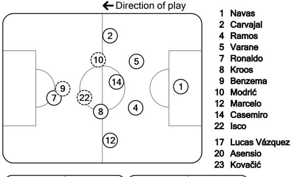 El reporte táctico de la Uefa demuestra claramente el modo en que Isco se desempeñó como "número diez": constantemente apareció en un extremo para asociarse con Marcelo, constantemente apareció en el otro para hacer lo propio con Carvajal.