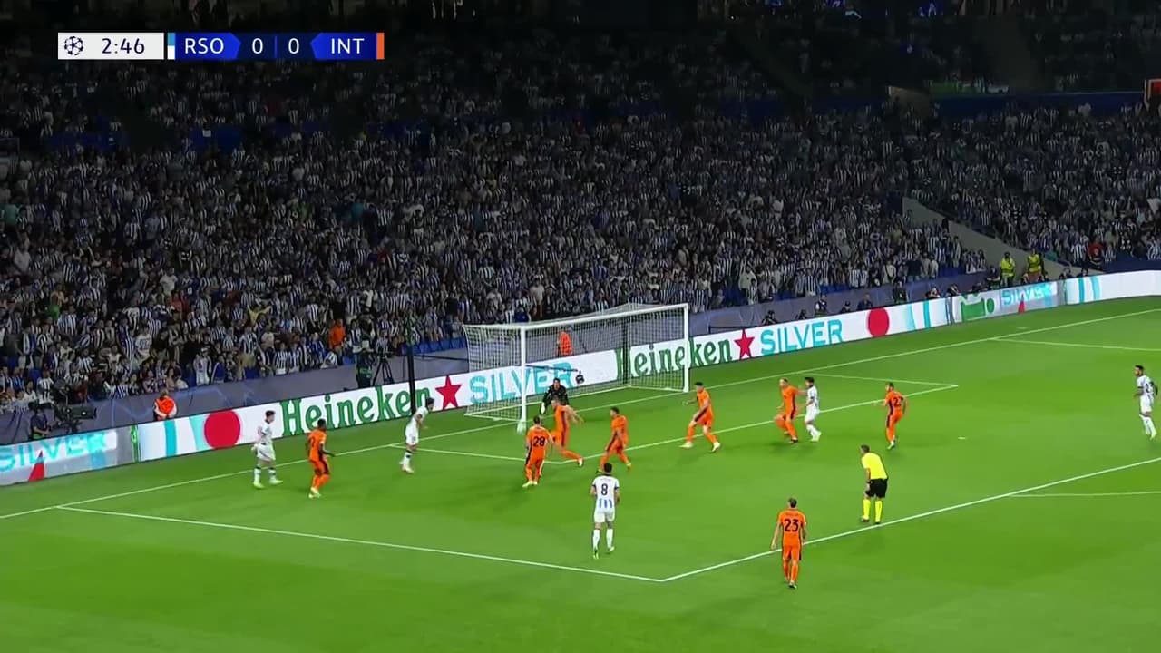 Ander Barrenetxea (Real Sociedad) remata al poste izquierdo| zurdazo desde el lado izquierdo dentro del área. Asistencia de Kieran Tierney con un centro al área.