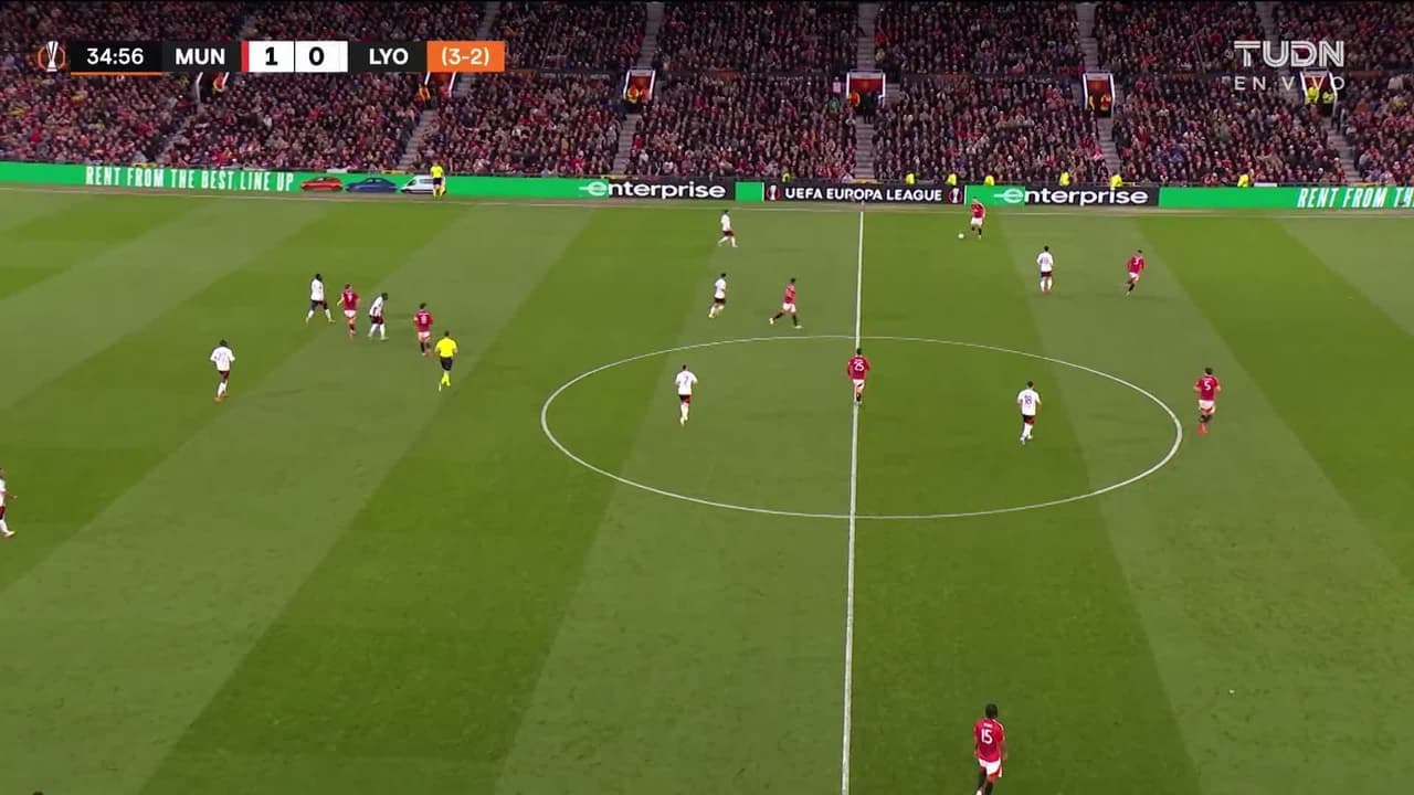 Bruno Fernandes (Manchester United) remata al travesaño| Disparo con la derecha desde el centro del área. Asistencia de Diogo Dalot después de un pase en profundidad.