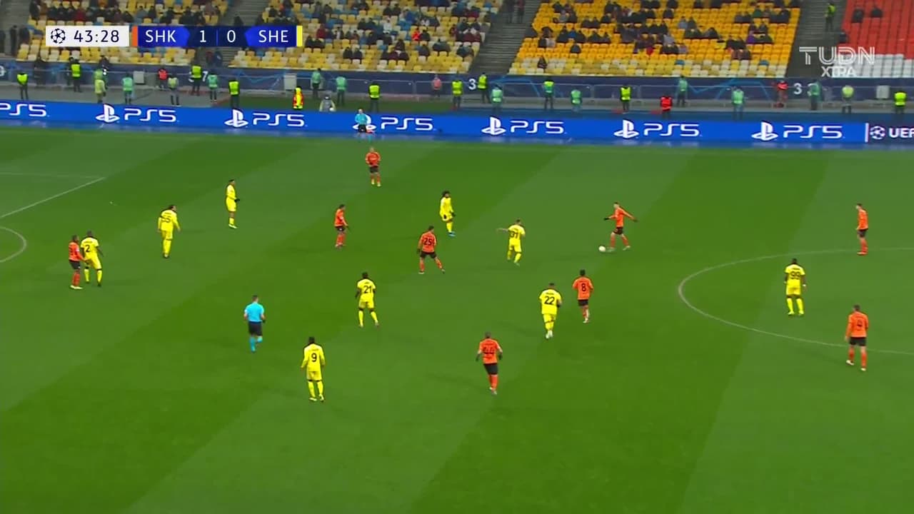 Dodô (Shakhtar Donetsk) remata al travesaño| Disparo con la derecha desde el centro del área. Asistencia de Heorhii Sudakov.