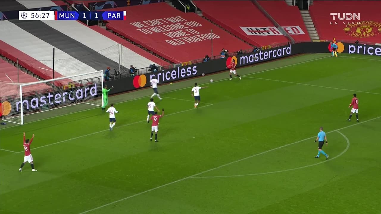 Edinson Cavani (Manchester United) remata al travesaño| Disparo con la derecha desde fuera del área. Asistencia de Anthony Martial tras un contragolpe.