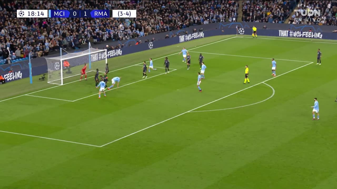 Erling Haaland (Manchester City) remata palo| disparo de cabeza desde el centro del área.