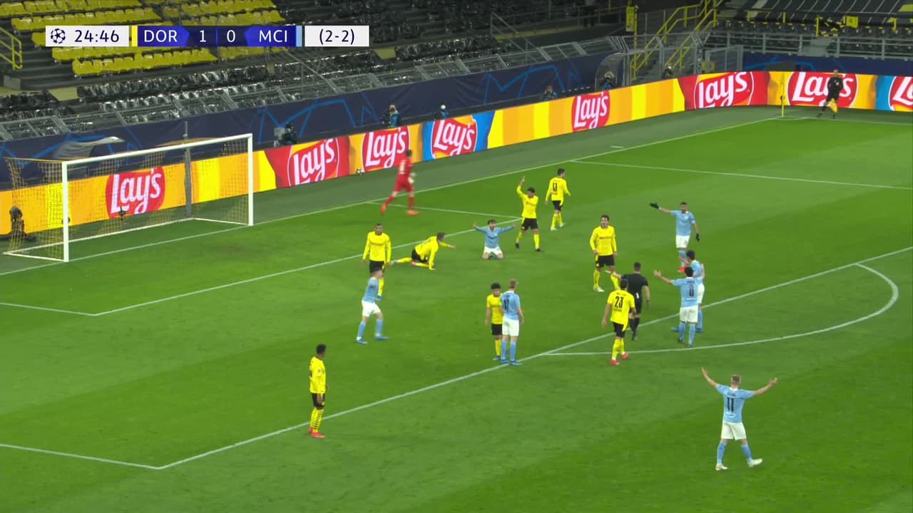 Kevin De Bruyne (Manchester City) remata al travesaño| Disparo con la derecha desde el centro del área.