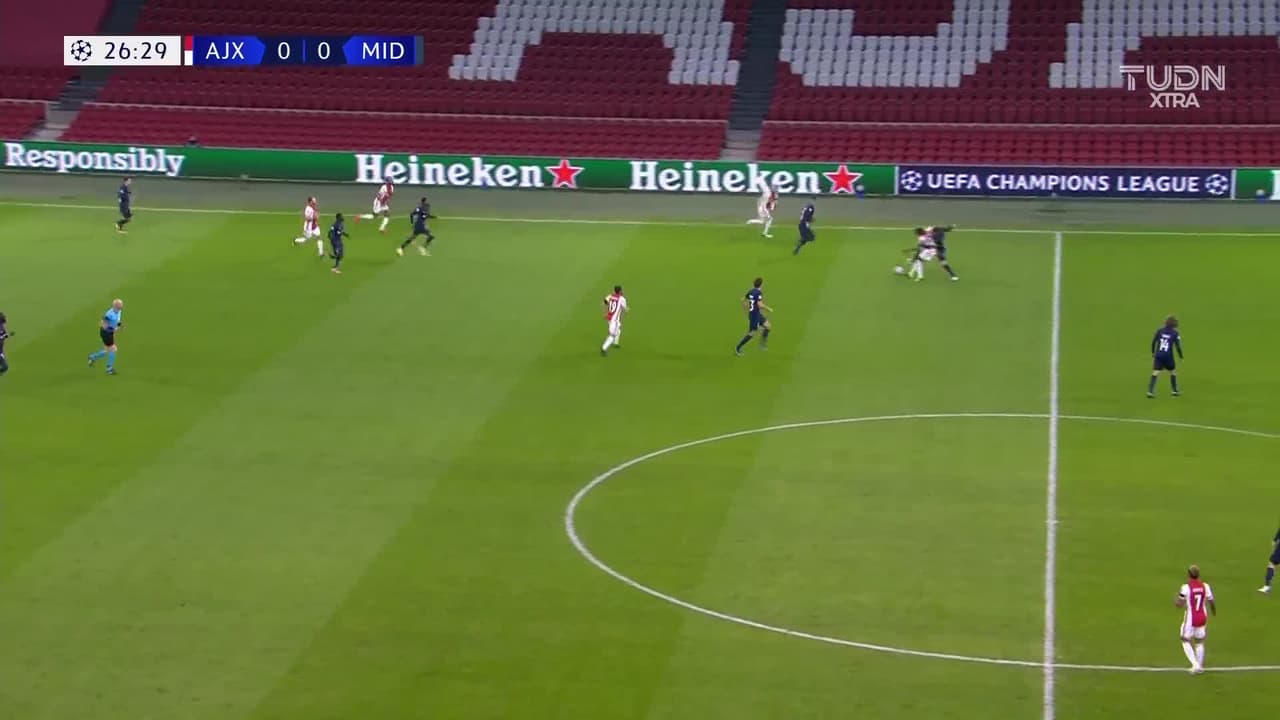 Lassina Traoré (Ajax) remata al travesaño| Disparo con la derecha desde fuera del área. Asistencia de Noussair Mazraoui.