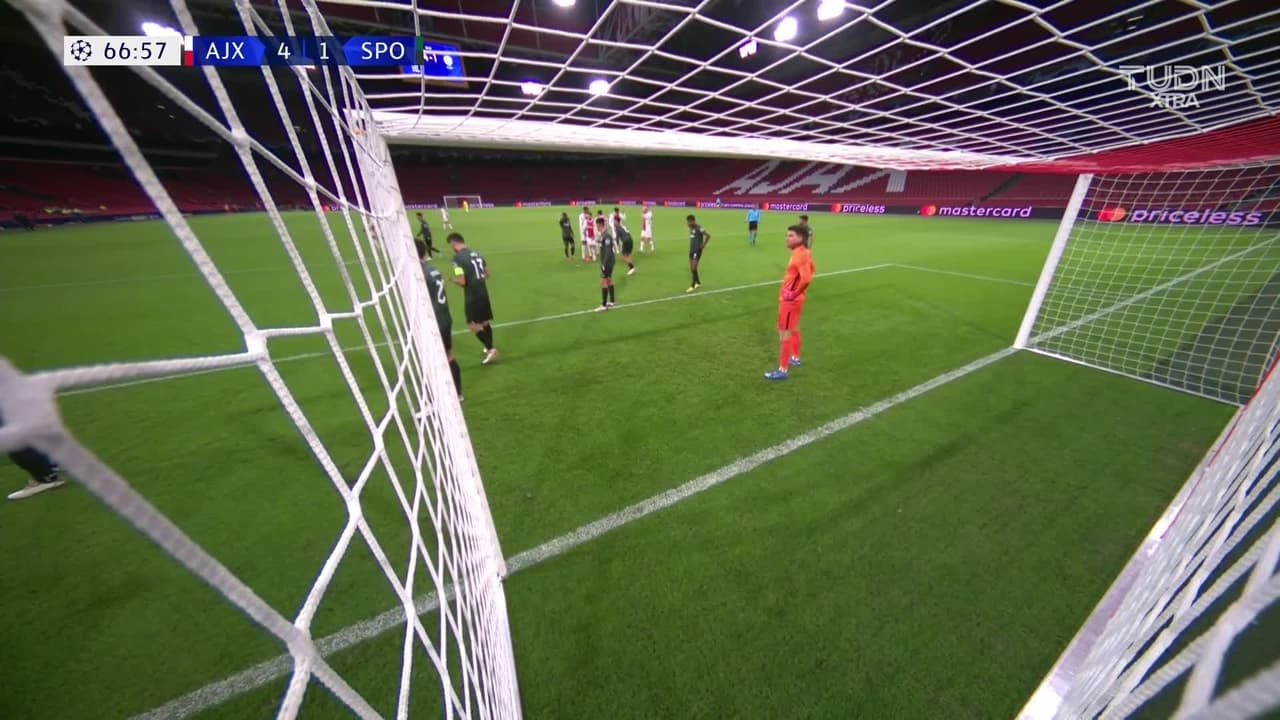 Lisandro Martínez (Ajax) remata al poste izquierdo| zurdazo desde el centro del área tras un saque de esquina.