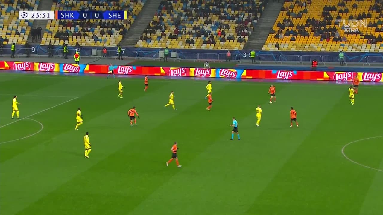 Manor Solomon (Shakhtar Donetsk) remata palo| Disparo con la derecha desde el lado izquierdo dentro del área.