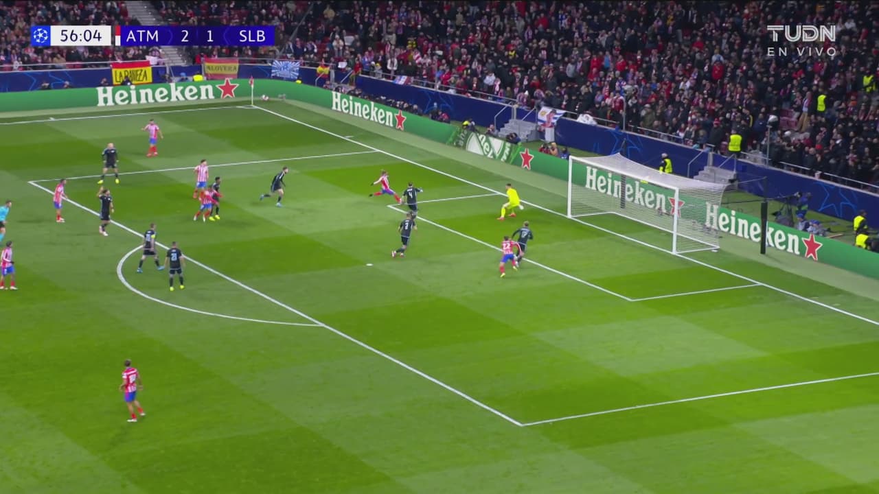 El delantero colchonero aprovecha el balón en el área para marcar su segundo gol del partido.