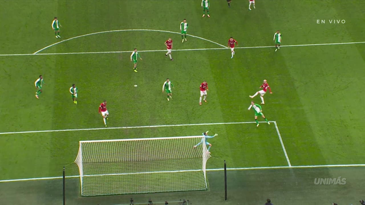 El lateral francés se agrega al ataque y se encuentra el balón en el área pero el poste le niega el gol.
