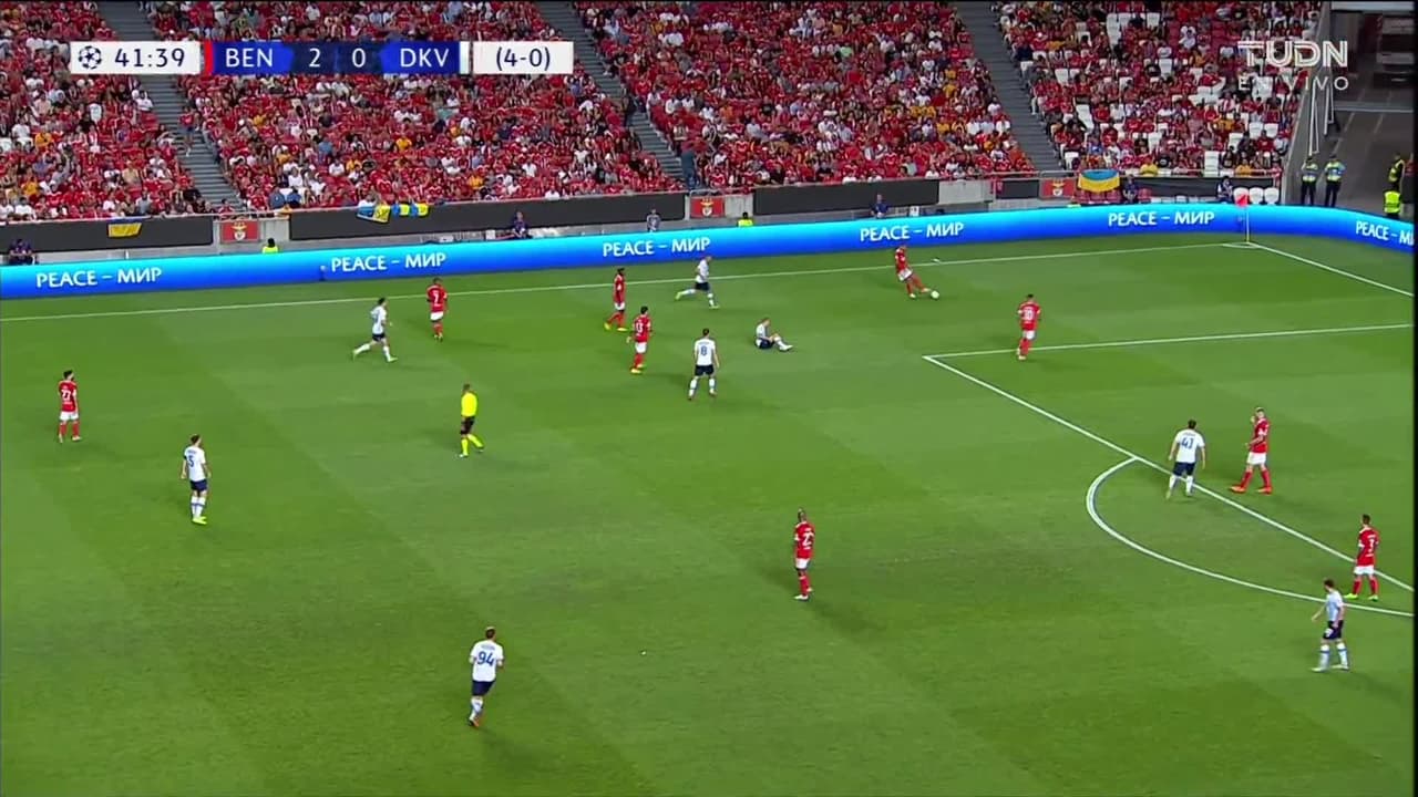 ¡Gol! Benfica 3| Dynamo Kyiv 0. David Neres (Benfica) zurdazo desde el lado derecho dentro del área disparo rastrero| junto al palo izquierdo. Asistencia de Gonçalo Ramos.