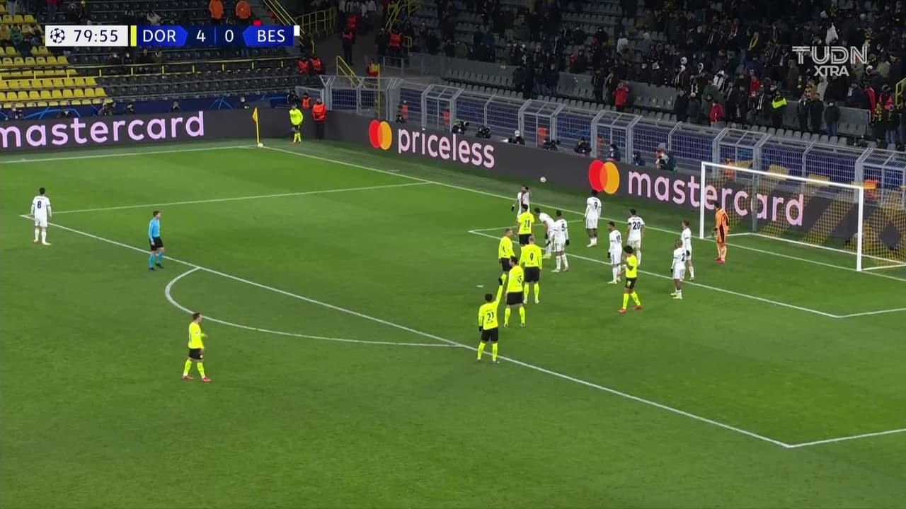 ¡Otra vez de cabeza! El delantero noruego del Dortmund remató muy bien para poner el 5-0 sobre Besiktas.