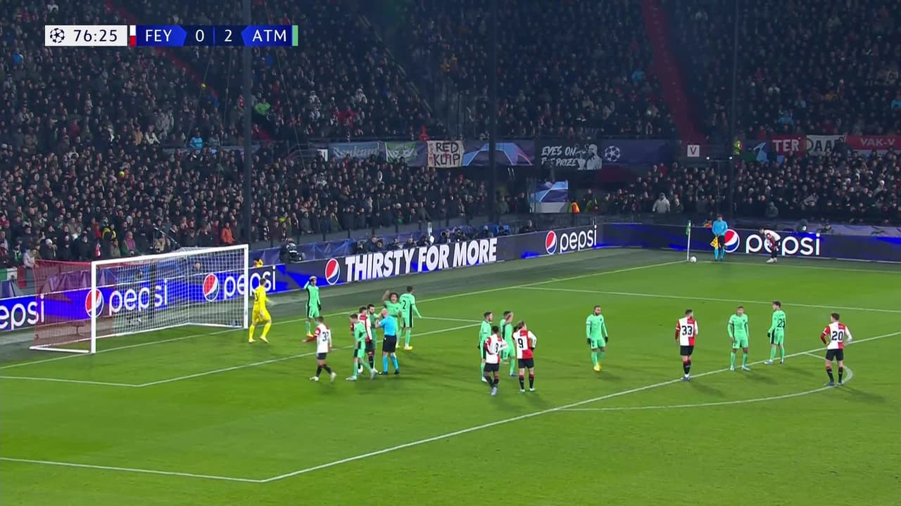 ¡Gol! Feyenoord 1| Atlético de Madrid 2. Mats Wieffer (Feyenoord) disparo de cabeza desde el centro del área tras un saque de esquina.