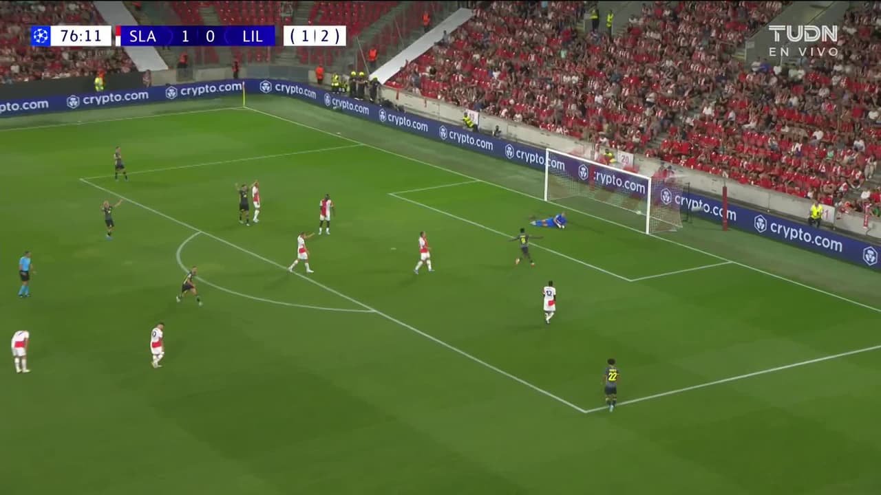 ¡Gol! Slavia Prague 1| Lille 1. Edon Zhegrova (Lille) zurdazo desde fuera del área por el lado derecho de la portería. Asistencia de Jonathan David.