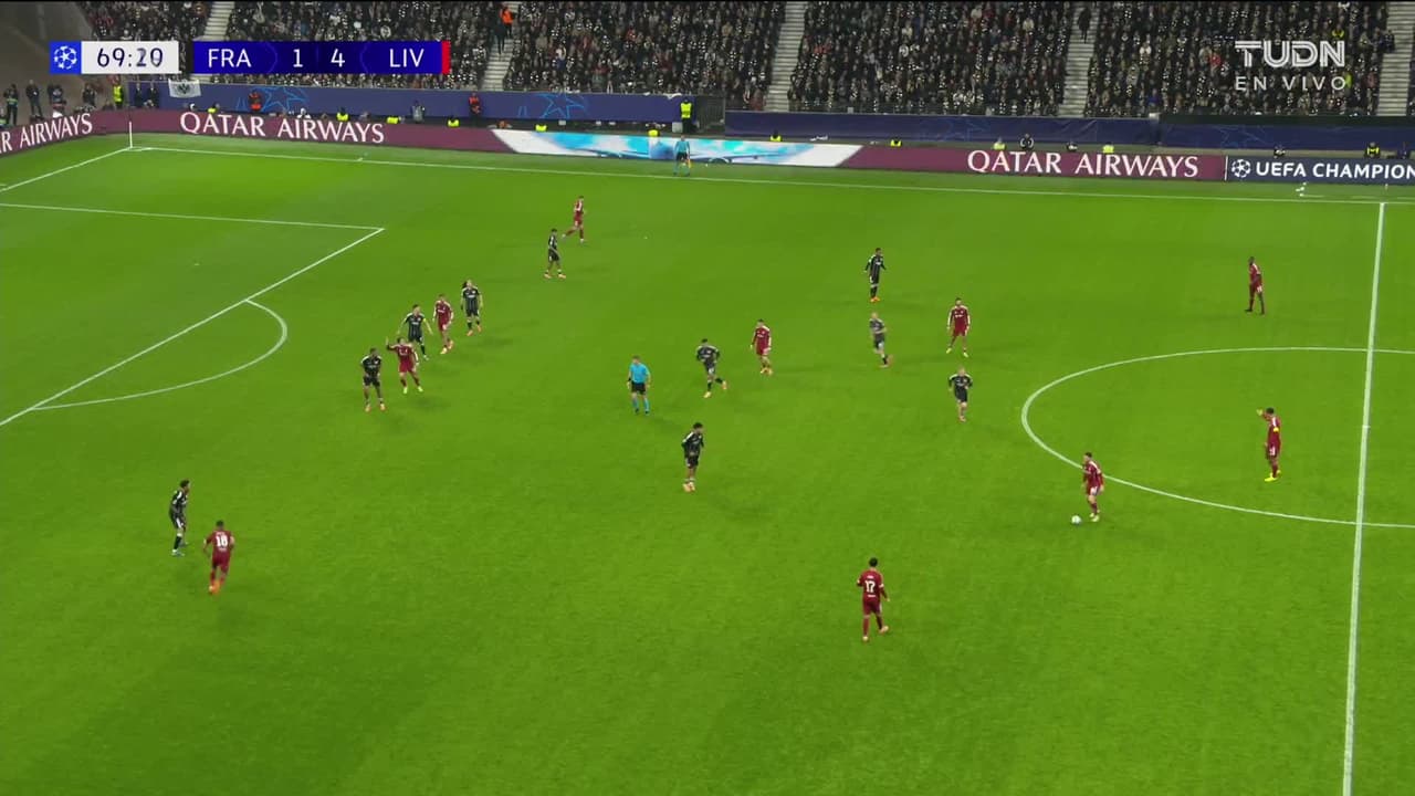 ¡Gol! Eintracht Frankfurt 1| Liverpool 5. Dominik Szoboszlai (Liverpool) Disparo con la derecha desde fuera del área.