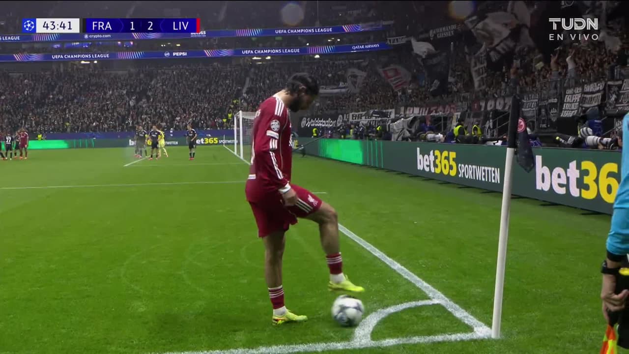 ¡Gol! Eintracht Frankfurt 1| Liverpool 3. Ibrahima Konaté (Liverpool) disparo de cabeza desde el centro del área tras un saque de esquina.