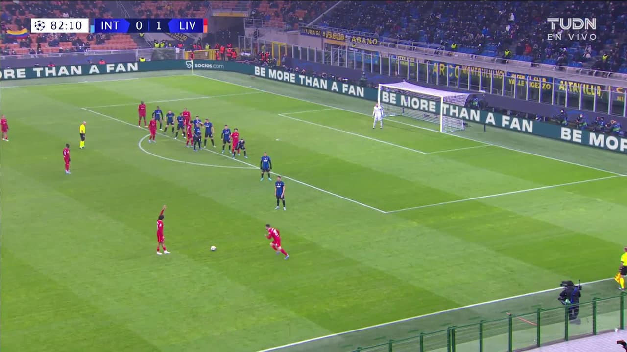 ¡Gol! Internazionale 0| Liverpool 2. Mohamed Salah (Liverpool) zurdazo desde el centro del área por el lado derecho de la portería tras el cobro de una falta.