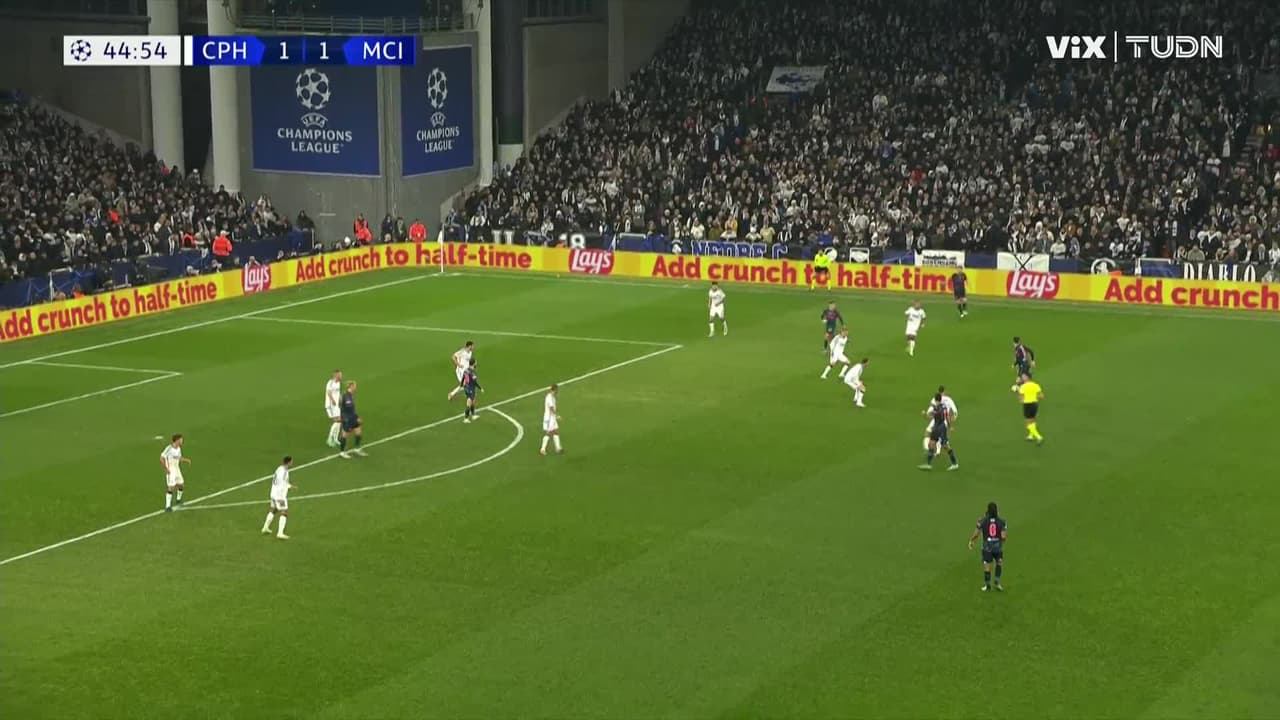 ¡Gol! FC København 1| Manchester City 2. Bernardo Silva (Manchester City) zurdazo desde el centro del área.
