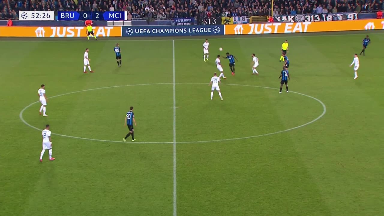 ¡Gol! Club Brugge 0| Manchester City 3. Kyle Walker (Manchester City) Disparo con la derecha desde el lado derecho dentro del área disparo rastrero| junto al palo izquierdo. Asistencia de Kevin De Bruyne después de un pase en profundidad.