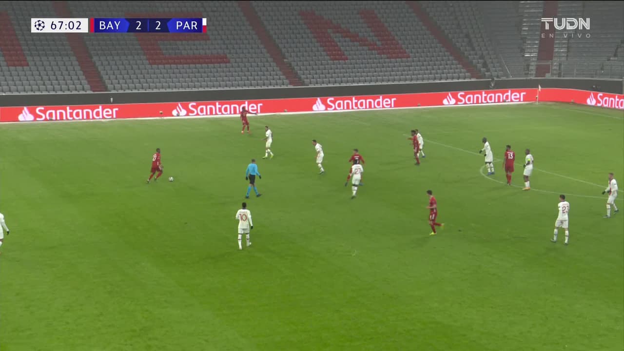 ¡Gol! FC Bayern München 2| Paris Saint-Germain 3. Kylian Mbappé (Paris Saint-Germain) Disparo con la derecha desde el lado izquierdo dentro del área.