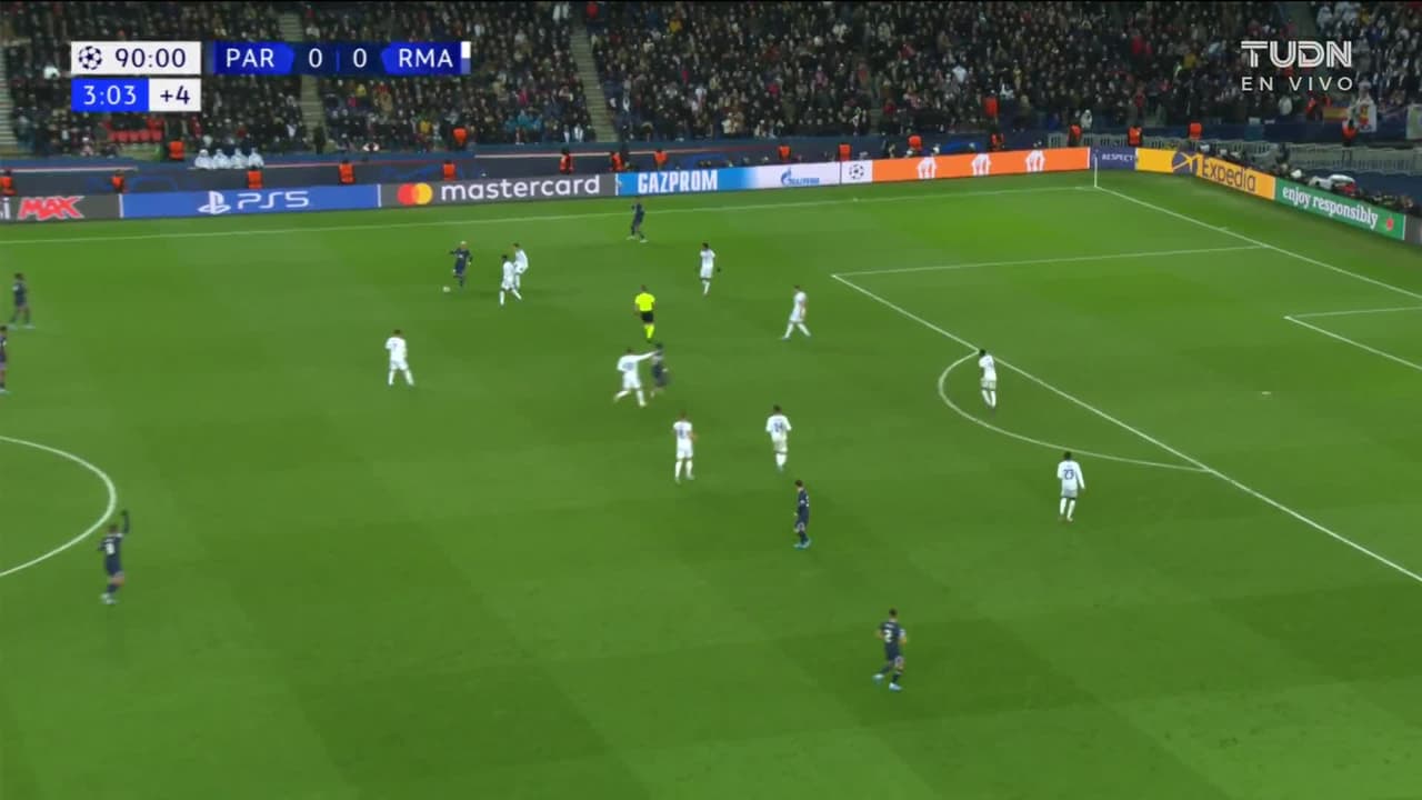 ¡Gol! Paris Saint-Germain 1| Real Madrid 0. Kylian Mbappé (Paris Saint-Germain) Disparo con la derecha sin ángulo desde la izquierda.