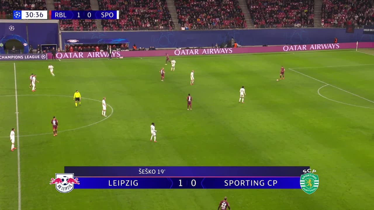 ¡Gol! RB Leipzig 2| Sporting Lisbon 0. David Raum (RB Leipzig) zurdazo desde el centro del área.