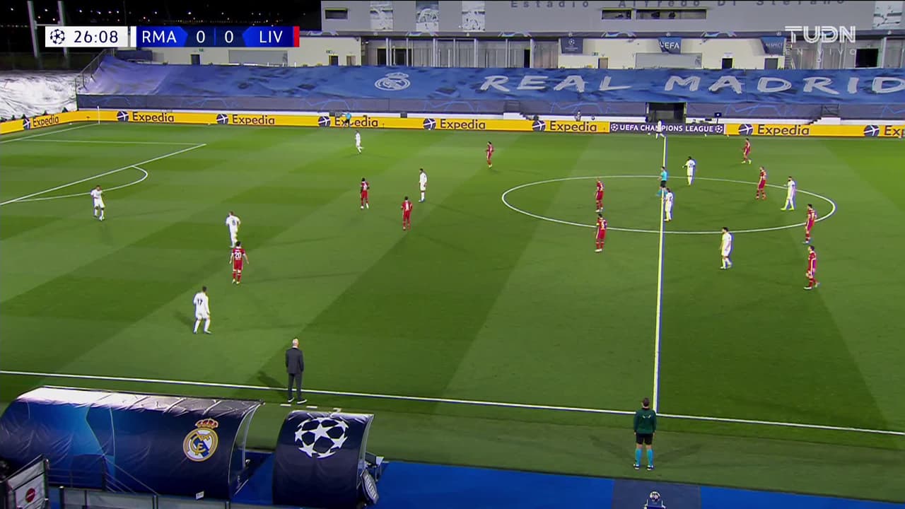 ¡Gol! Real Madrid 1| Liverpool 0. Vinícius Júnior (Real Madrid) Disparo con la derecha desde el centro del área.