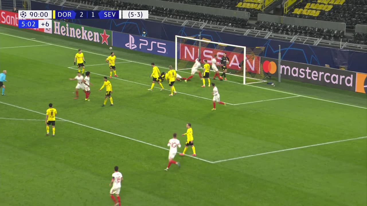 ¡Gol! Borussia Dortmund 2| Sevilla 2. Youssef En-Nesyri (Sevilla) disparo de cabeza desde el centro del área.