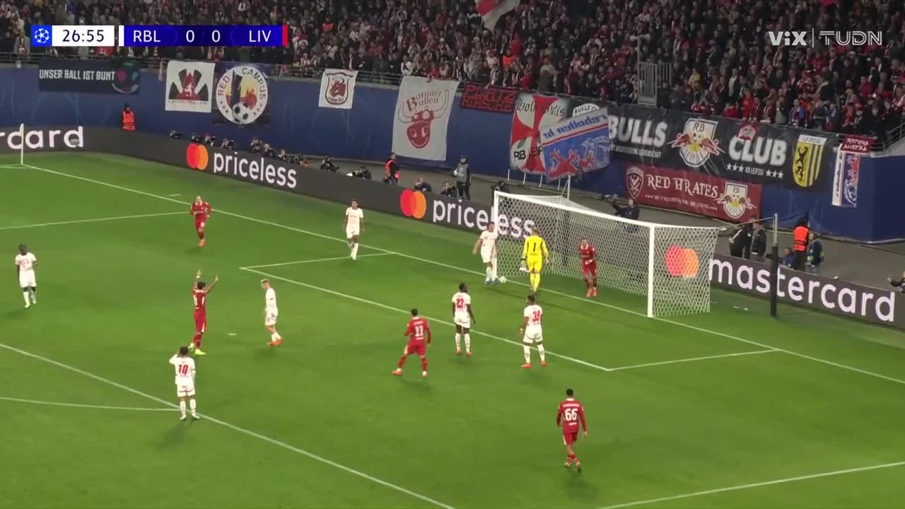 Mala salida de la defensiva del Leipzig y el uruguayo definió con testarazo cruzado para el 0-1 en la UEFA Champions League.