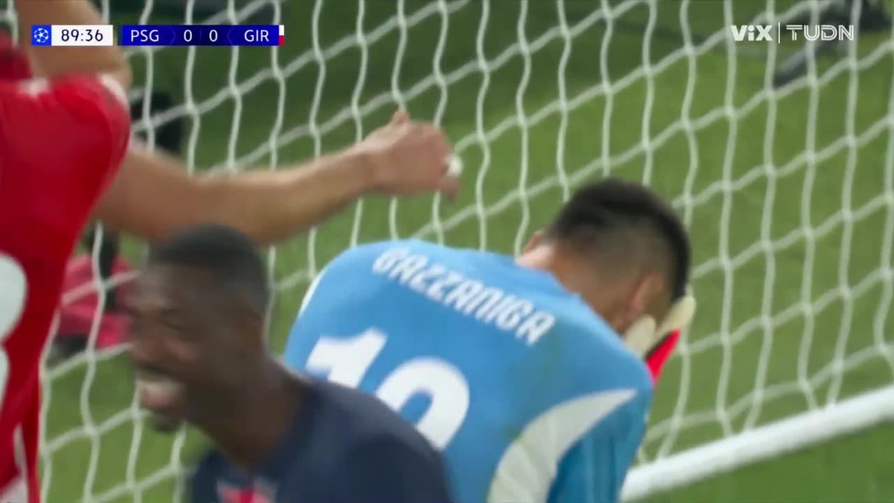 Nuno Mendes llega por izquierda y sacó tiro-centro a ras de pasto que se le pasó por entre las manos al portero para el 1-0 del PSG en Champions League.