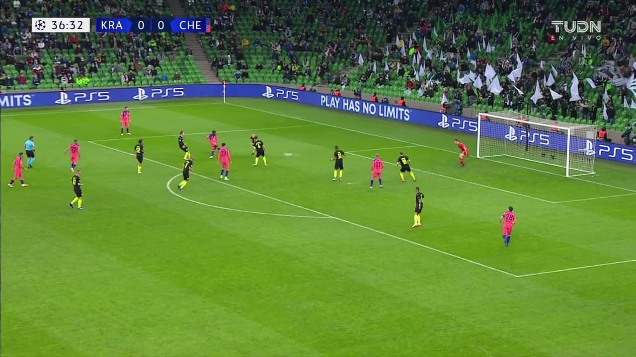 ¡Gol! FK Krasnodar 0| Chelsea 1. Callum Hudson-Odoi (Chelsea) Disparo con la derecha desde el centro del área disparo rastrero| junto al palo izquierdo. Asistencia de Kai Havertz.