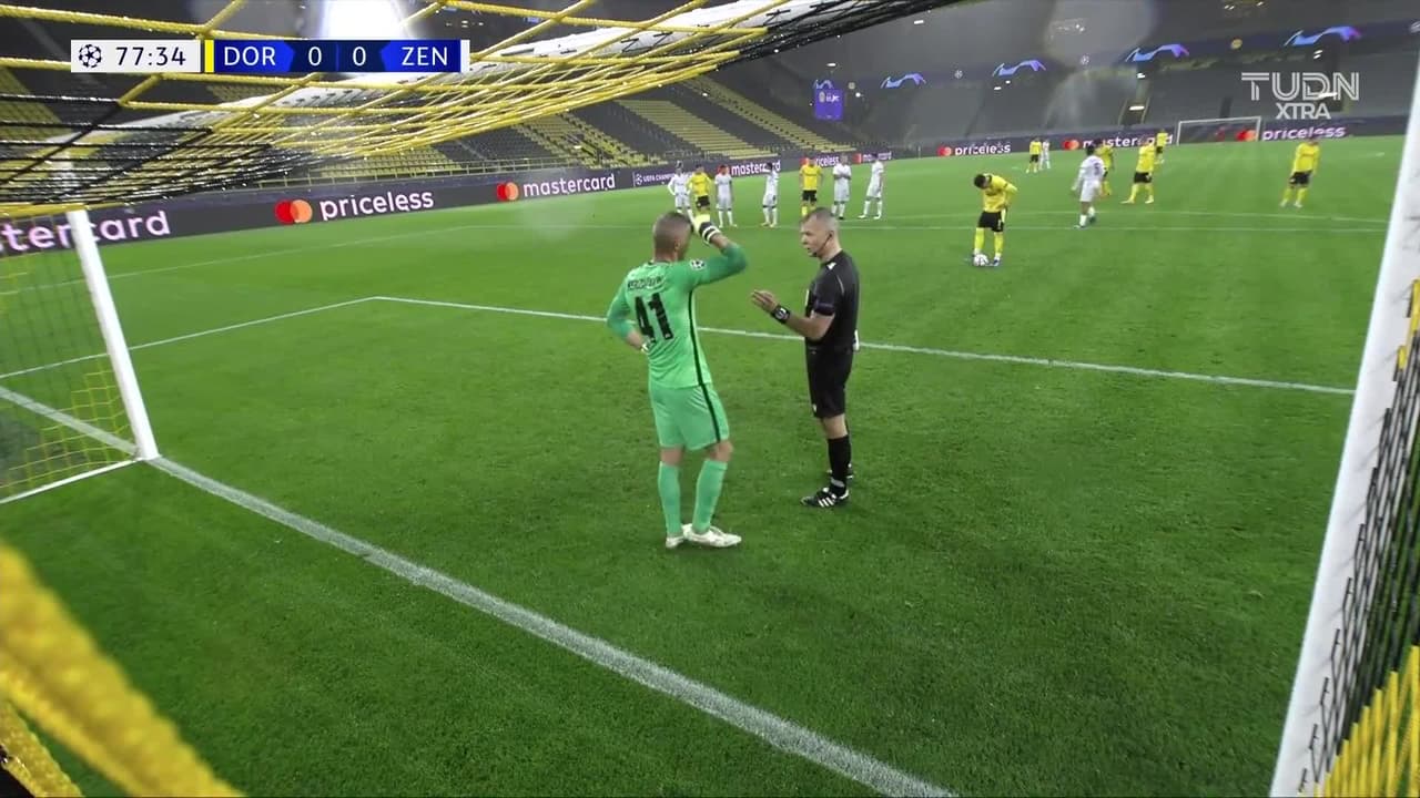 ¡Gol! Borussia Dortmund 1| Zenit St Petersburg 0. Jadon Sancho (Borussia Dortmund) convirtió el penalti Disparo con la derecha por el lado derecho de la portería.