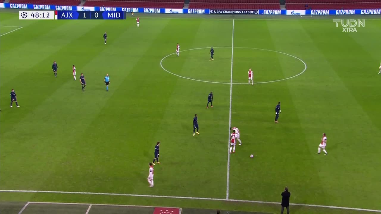 ¡Gol! Ajax 2| FC Midtjylland 0. Noussair Mazraoui (Ajax) Disparo con la derecha desde el centro del área por el lado derecho de la portería. Asistencia de Dusan Tadic.
