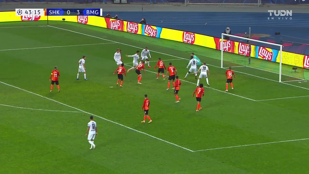 ¡Gol! Shakhtar Donetsk 0| Borussia M'Gladbach 4. Ramy Bensebaini (Borussia M'Gladbach) zurdazo desde muy cerca disparo rastrero| junto al palo izquierdo tras un saque de esquina.