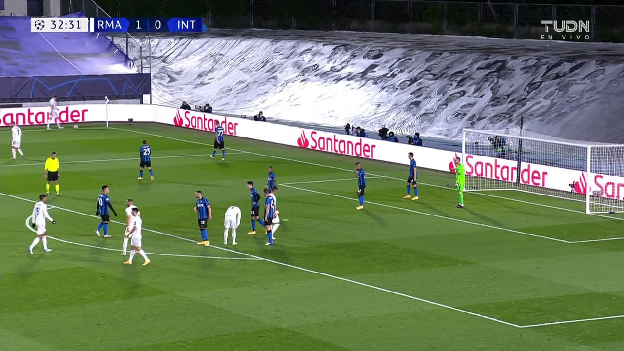 ¡Gol! Real Madrid 2| Internazionale 0. Sergio Ramos (Real Madrid) disparo de cabeza desde el centro del área por el lado derecho de la portería. Asistencia de Toni Kroos con un centro al área tras un saque de esquina.