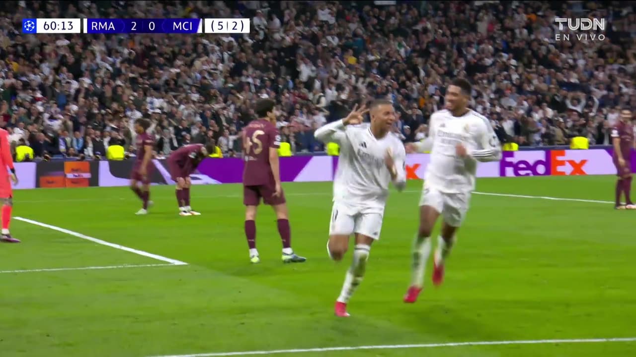 Bicicleta de Kylian y firma su tercer gol de la noche frente al Manchester City.