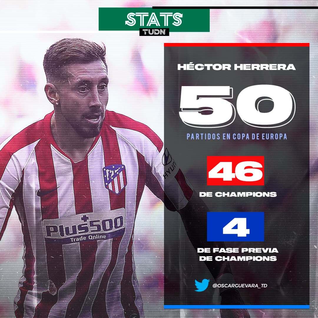 Héctor Herrera va de inicio por tercer juego consecutivo con la camiseta del Atlético de Madrid, segunda vez en Champions y eso continúa aumentando su cifra de juegos en Copa de Europa.