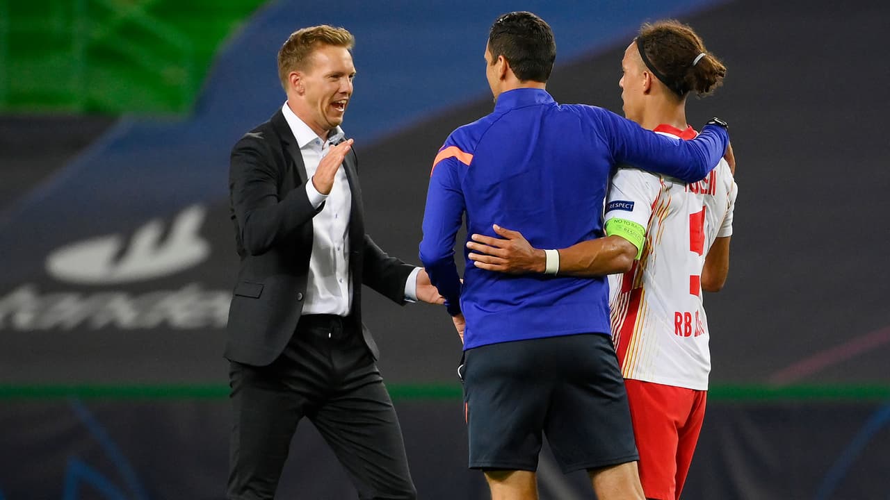 El delantero Yussuf Poulsen y su DT, Julian Nagelsmann, destacaron el triunfo ante Atlético.