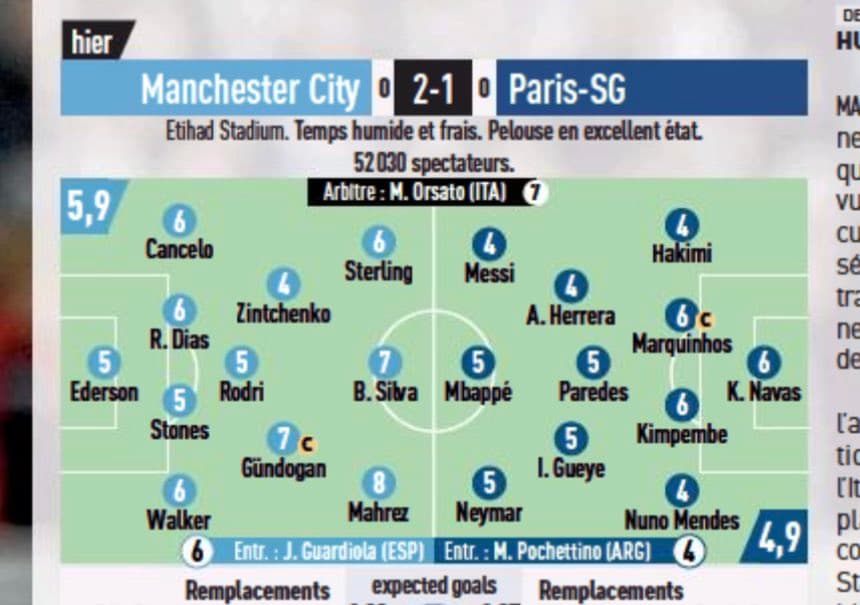 Por su parte, el diario L'Equipe de Francia desde el miércoles criticó la labor de Messi en el campo de Etihad y en su rotativo de este jueves le colocó un 4 de calificación por su pobre rendimiento.