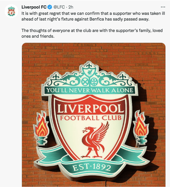 Liverpool expresó este jueves sus condolencias por la muerte de un aficionado que tuvo que recibir tratamiento médico en Anfield antes del partido de vuelta de Cuartos de Final de la UEFA Champions League disputado este miércoles en Inglaterra ante el Benfica portugués.