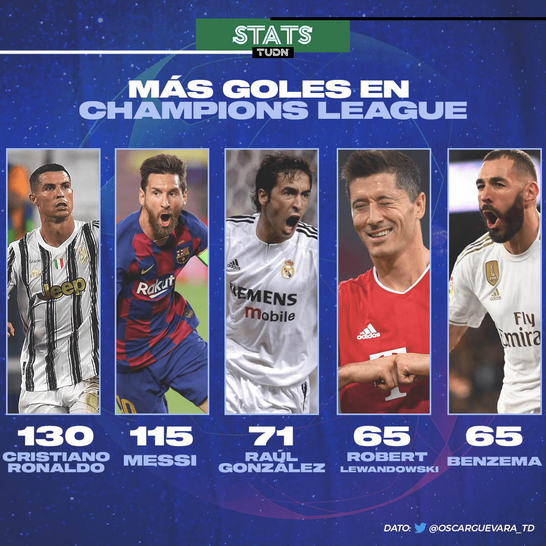 Donde CR7 mantiene la ventaja sobre el astro argentino es en goles generales en la Champions League, con 130 por 115 de Messi. Mientras, Robert Lewandowski llegó a 65 anotaciones igualó a Karim Benzema, tras su doblete este sábado al Chelsea.