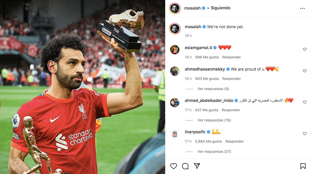 El futbolista egipcio publicó una imagen en sus redes sociales con los premios a máximo asistente de la Premier League, con 13 pases de gol, y la Bota de Oro, que compartió con 23 tantos con Heung-min Son, del Tottenham Hotspur.
