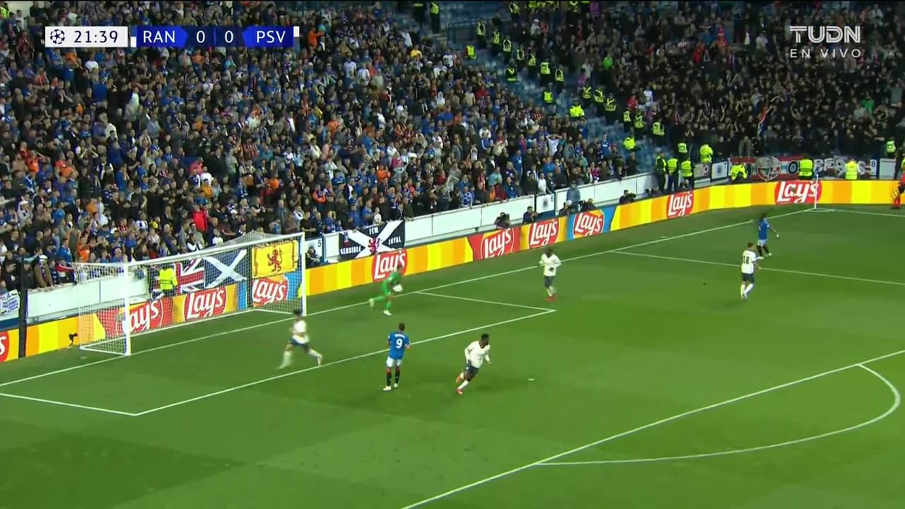Tiro atajado. Abdallah Sima (Rangers) Disparo con la derecha desde el lado derecho dentro del área.