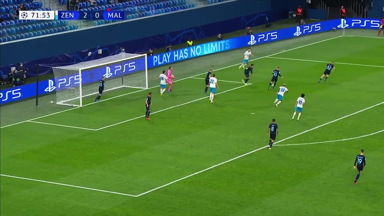 Remate parado bajo palos a rás de suelo. Aleksey Sutormin (Zenit San Petersburgo) remate con la derecha desde el lado derecho del interior del área. Asistencia de Malcom.