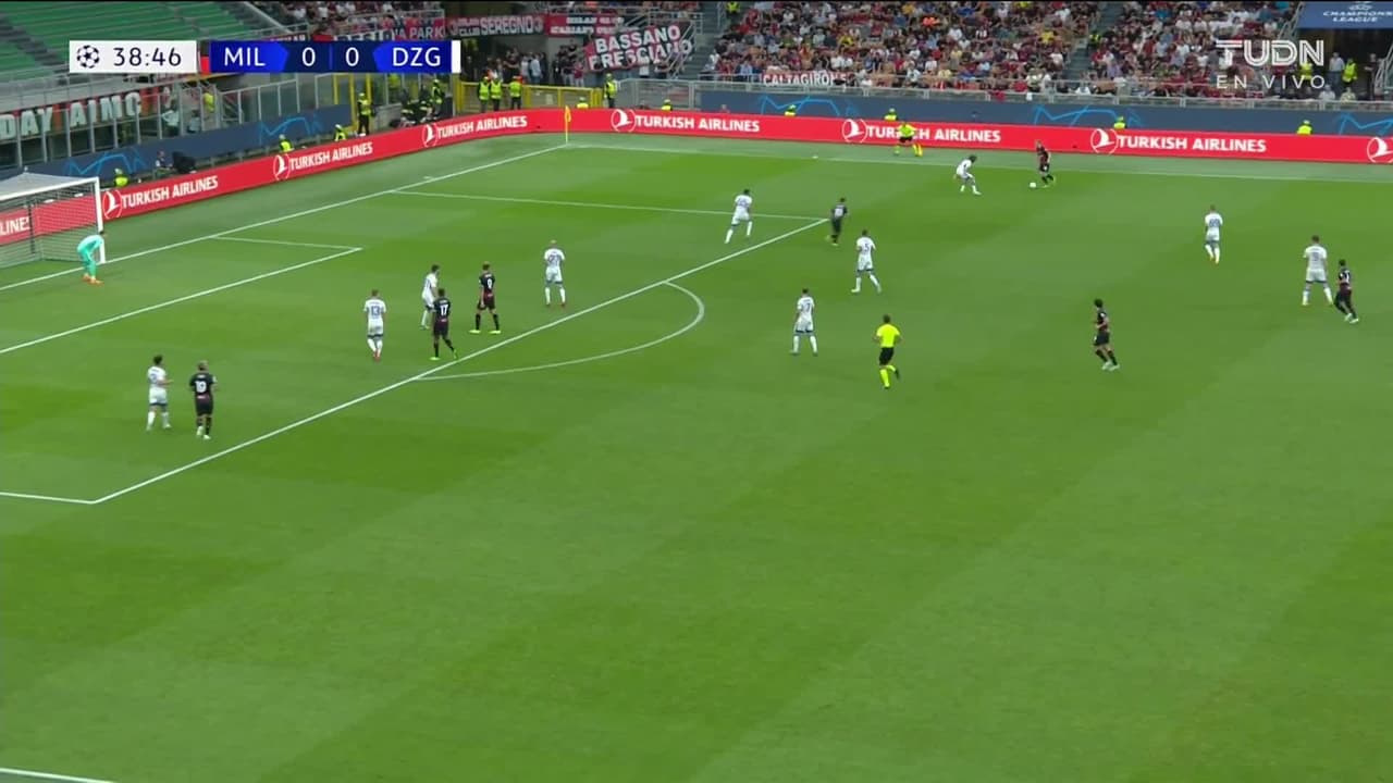 Tiro atajado Por arriba en el centro del arco. Alexis Saelemaekers (Milan) zurdazo desde fuera del área. Asistencia de Sandro Tonali.