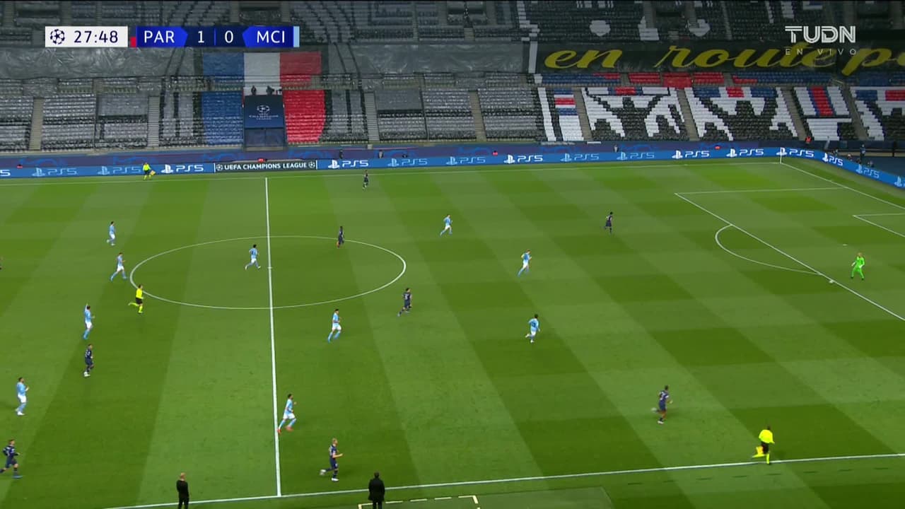 Tiro atajado raso al centro del arco. Ángel Di María (Paris Saint-Germain) zurdazo desde el centro del área.