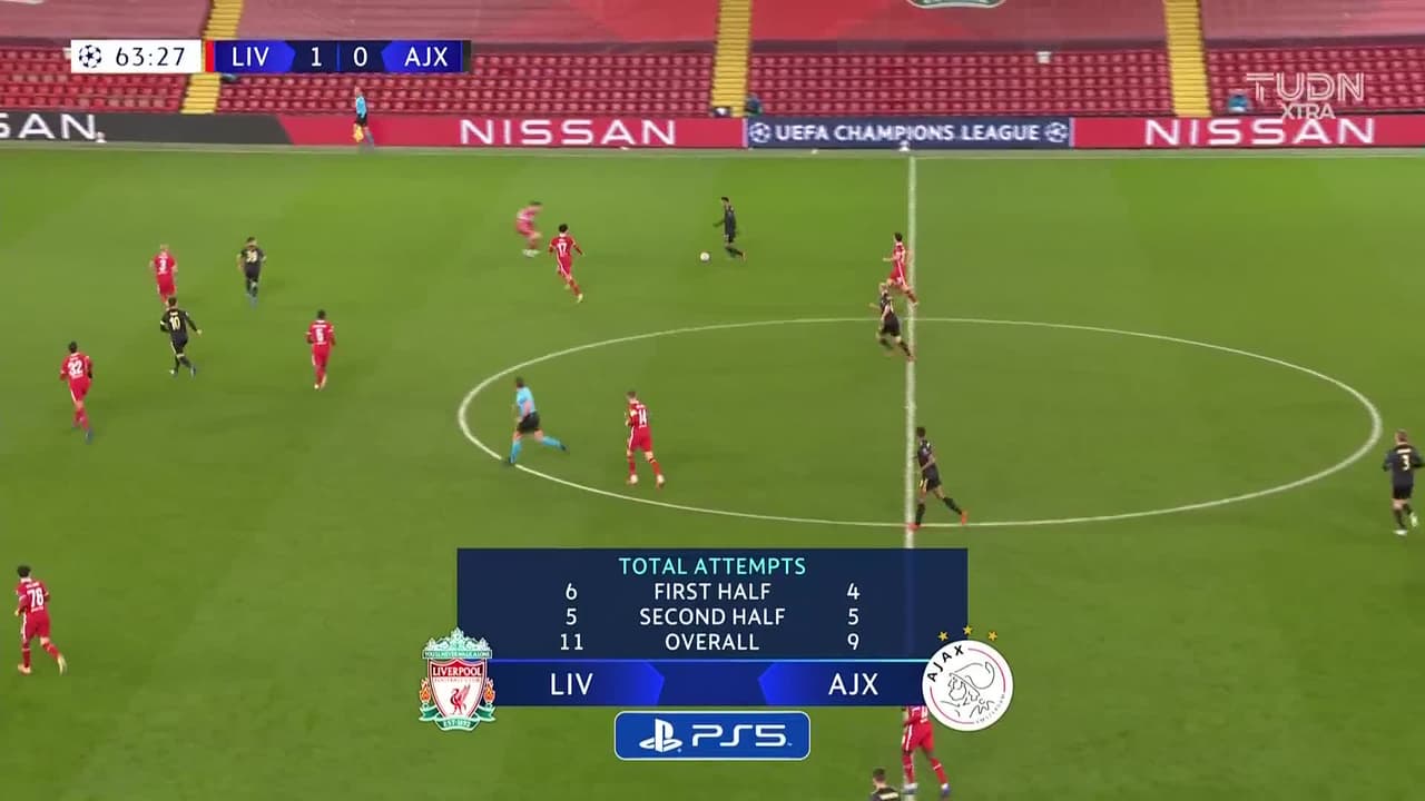 Tiro atajado raso al centro del arco. Antony (Ajax) zurdazo desde el lado derecho dentro del área. Asistencia de Dusan Tadic después de un pase en profundidad.